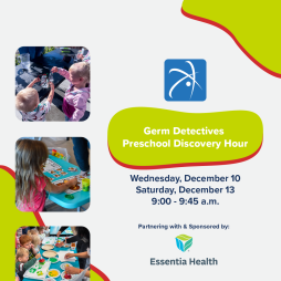 We’re teaming up with Essentia Health to explore the hidden world of germs for December’s Preschool Discovery Hour! Join us for hands-on activities that help little learners understand how germs spread, what they might look like, and how to keep themselves healthy.