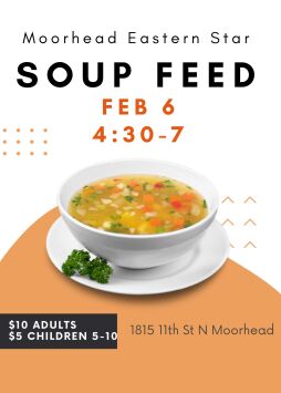 Come to the Moorhead Masonic Family Center, 1815 11th St N Moorhead, on Feb 6 from 4:30-7 for the warm soup feed. $10 for adults, $5 for children 5-10.